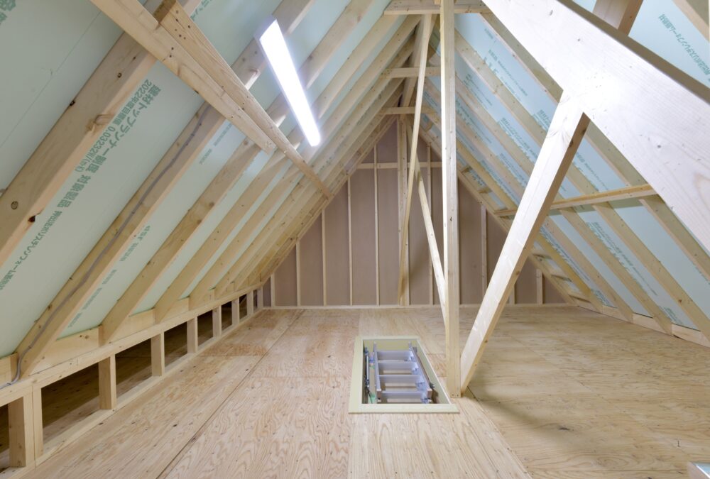 ツーバイフォー工法は柱を使わずに建物をつくります。これは、室内空間だけでなく小屋裏でも同じ。つまり小屋裏に柱がない空間が生まれ、ガレージの小屋裏などを広大な収納スペースとして利用可能になることを意味します。生活していると何かと物が増えていくもの。これは嬉しい点ですよね。